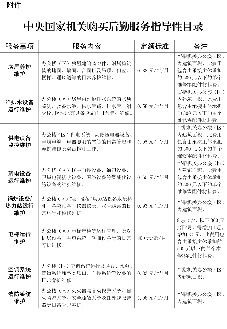 第七条 购买后勤服务指导性目录主要包括:物业服务(房屋养护维护、给排水设备运行维护、供电设备监控维护、弱电设备运行维护、锅炉设备/热力站运行维护、电梯运行维护、空调系统运行维护、消防系统维护、保洁服务、绿化服务)、办公家具维修服务、安全保卫服务、餐饮服务、传达收发服务、会议服务、文印服务等。